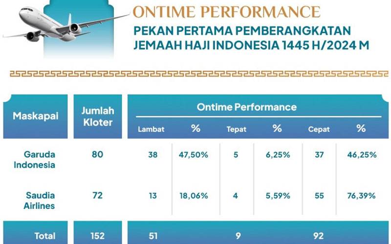 Sedangkan untuk Saudia Airlines, dalam sepekan ini mengalami keterlambatan pemberangkatan hingga 18,06% dari total 72 penerbangan. Total keterlambatan mencapai empat jam tujuh menit.