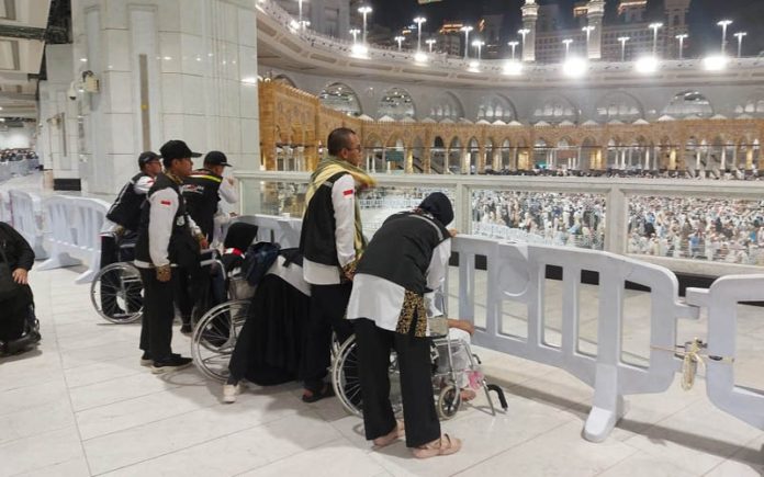 Moeslim.id | Petugas Penyelenggara Ibadah Haji (PPIH) Arab Saudi 1445 hijriyah memfasilitasi jemaah haji Indonesia yang belum pernah ke Masjidil Haram, untuk melihat dan berdoa di depan Ka’bah.