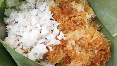 - Campurkan kelapa muda parut dengan gula merah dan garam
