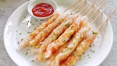 - Ambil tusuk bambu, putar dan lilitkan seperti telur gulung