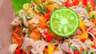 - Panaskan minyak goreng, siram minyak panas ke bahan-bahan yang ada