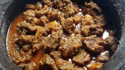 - Setelah mendidih dan hampir kering, tambahkan air sampai daging empuk