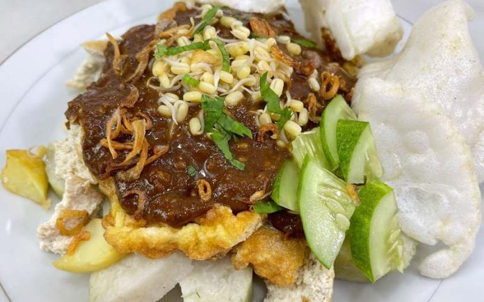 Ditambah juga dengan sedikit taoge, dan irisan ketimun dipotong kecil-panjang seperti acar, lalu setelah disiram dengan saus kacang dengan campuran petis di atasnya, ditaburkan kerupuk udang yang bentuknya kecil-kecil.