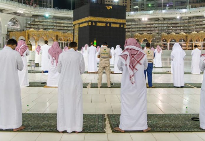 “Namun setelah terbitnya izin bolehnya melaksanakan shalat jum’at dan jama’ah lima waktu di masjid-masjid Kerajaan Saudi Arabia, dengan komitmen mentaati protokol pencegahan COVID-19, mulai hari Ahad, 8 Syawal 1441 H, kementerian agama menerbitkan protokol pelaksanaan ibadah di masjid saat Pandemi. Diantaranya, mewajibkan jama’ah sholat merenggangkan shaf sejarak dua meter antara makmum.